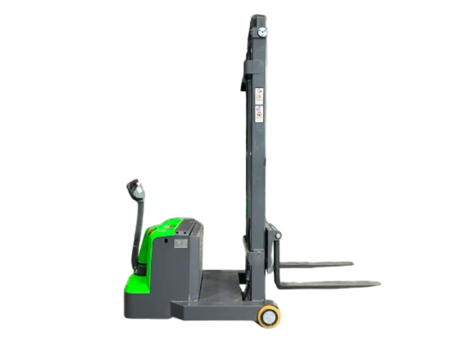 Electric counterbalanced pedestrian stacker with 1000kg capacity, ideal for narrow aisles and high-rack stacking.