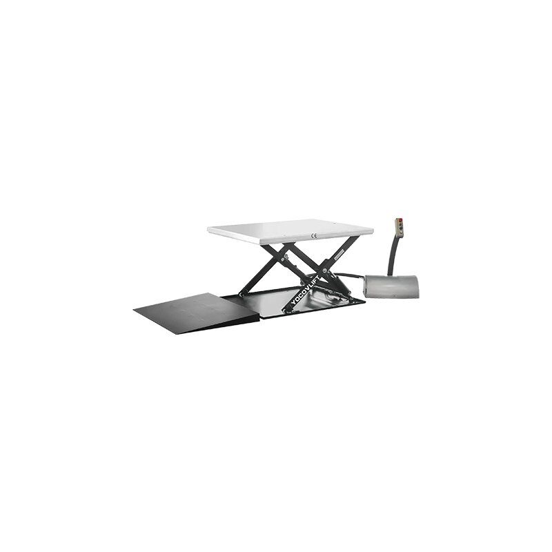 Compact hydraulic electric lift table equipped with integrated ramp for easy manual or electric pallet truck access
